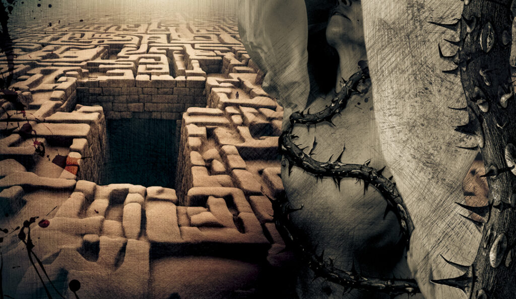El laberinto recorre toda la obra: no como símbolo del extravío, sino como estructura del dominio. En él se cruzan los caminos de lo sagrado y lo colonial, del cuerpo y la tierra.