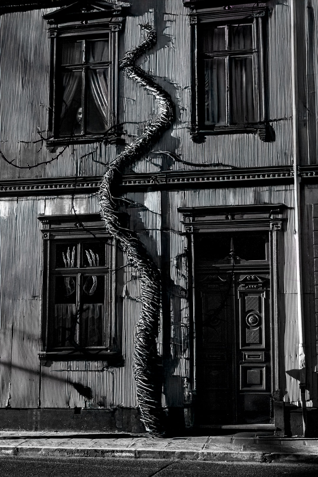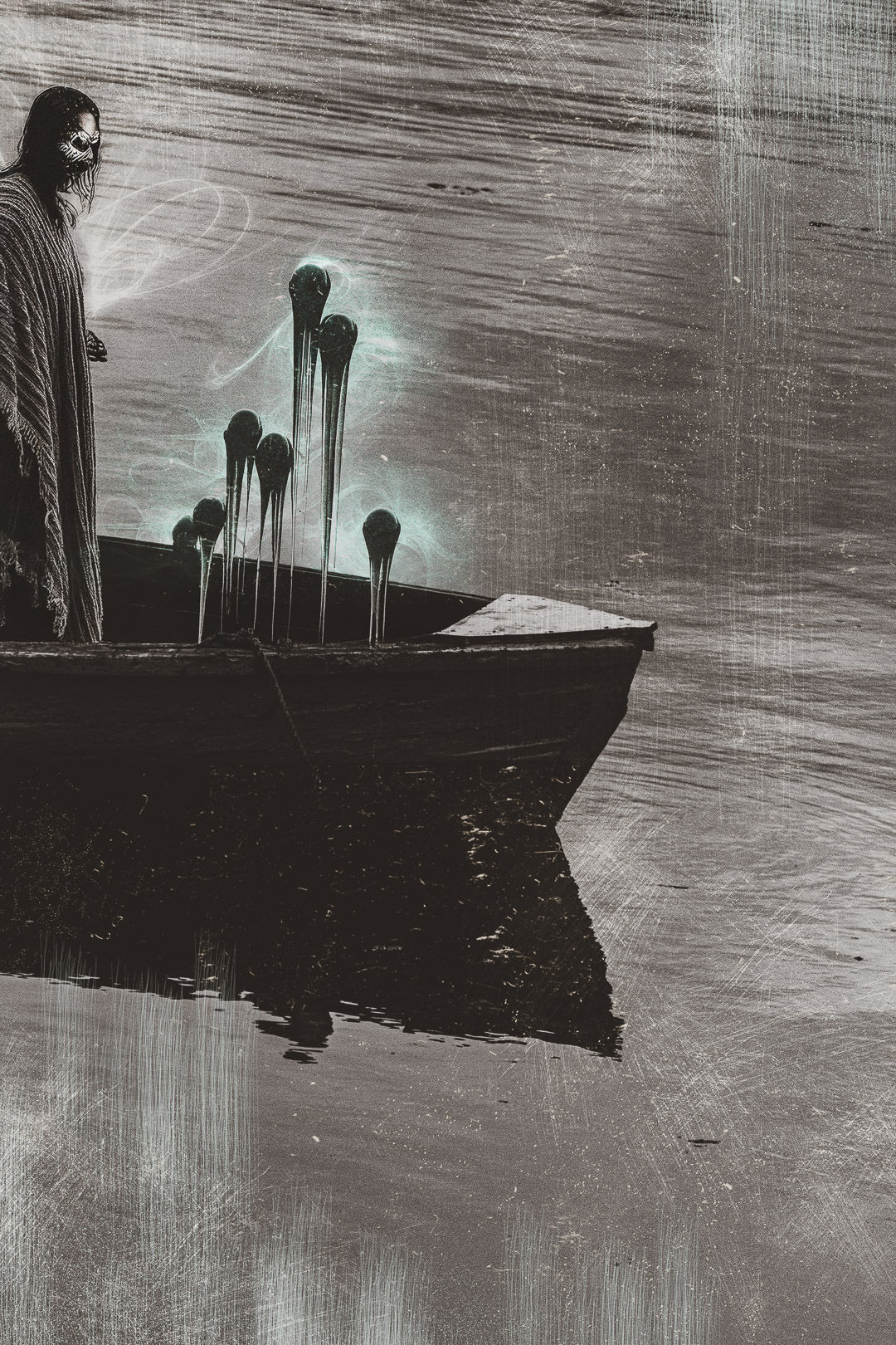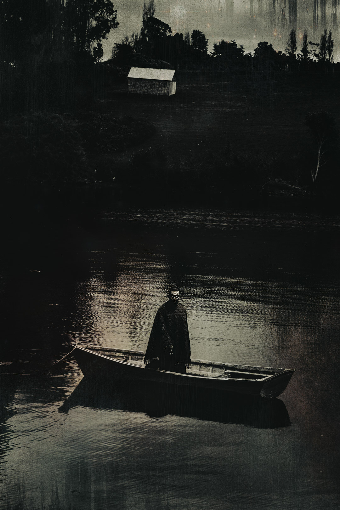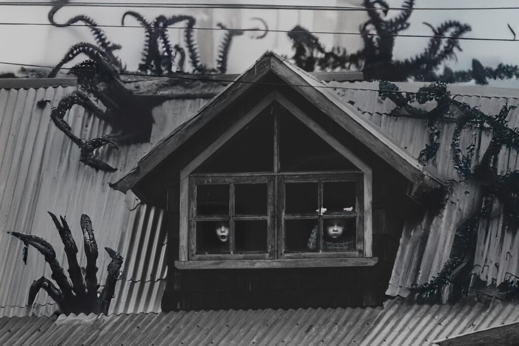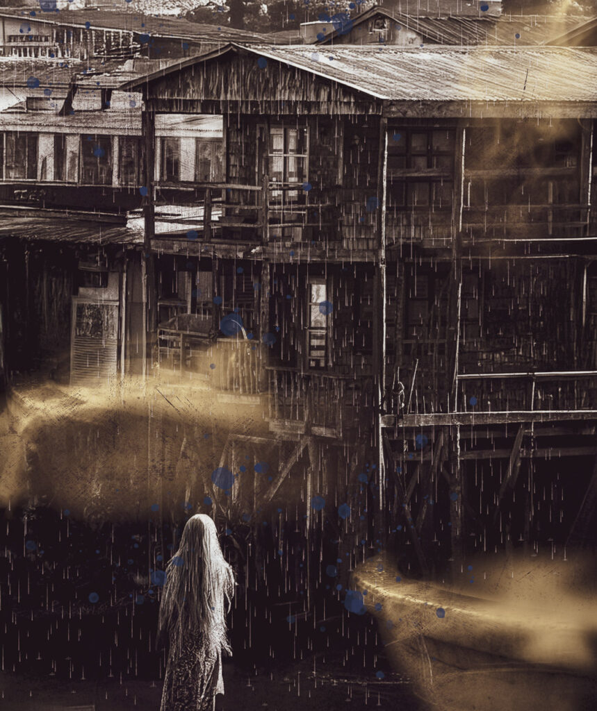 Las imágenes nacen de registros fotográficos reales, intervenidos como quien altera un testimonio para decir lo que la fotografía sola no puede. En Chiloé, lo visible nunca alcanza.